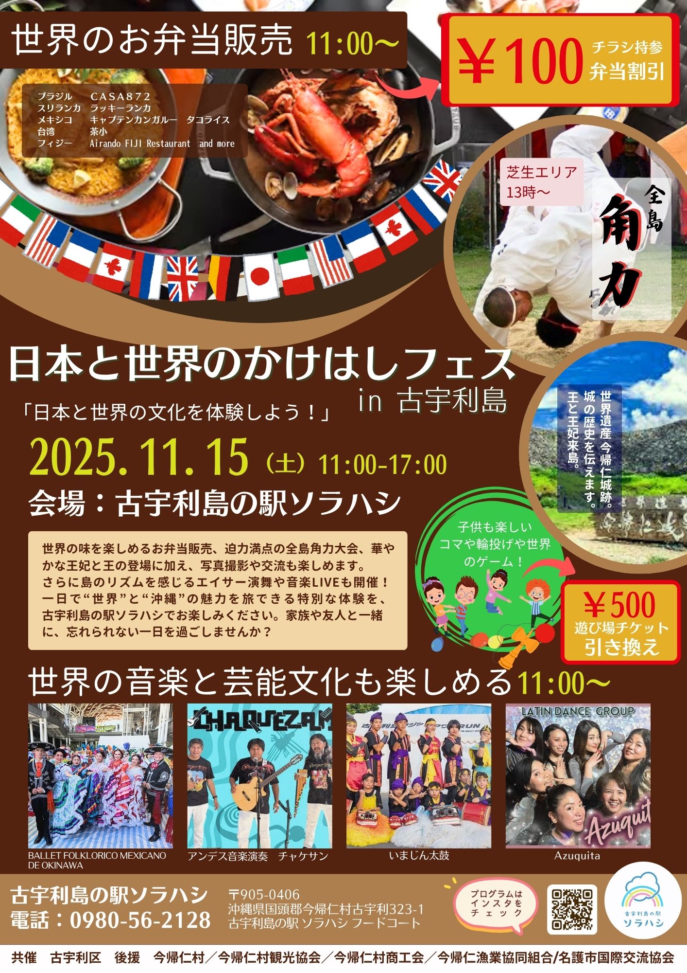 世界の味を楽しめるお弁当販売、迫力満点の全島角力大会、華やかな王妃と王の登場に加え写真撮影や交流も楽しめます。 さらに島のリズムを感じるエイサー演舞や音楽LIVEも開催! 一日で“世界”と“沖縄”の魅力を旅できる特別な体験を、 古宇利島…